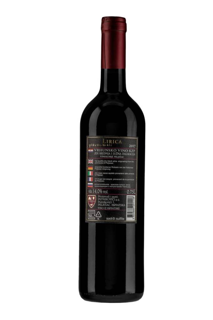 Lirica je vrhunsko crno vino sorte plavac mali.